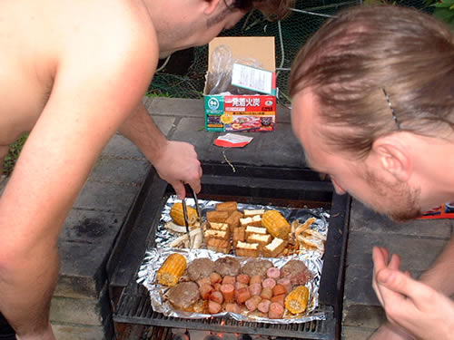 At the Cotton Cafe we put Kumi on the back of my bike and set off for food. The conveni had nothing so Jason and I had to race off to BELC supermarket 4km down the road- where I picked up sausages, ground beef, yakiniku (BBQ grill Korean-style) meat, assorted veg, plates, and etc.. I spent quite a while picking stuff out as I didn’t want to not buy enough, or not buy the right stuff.
