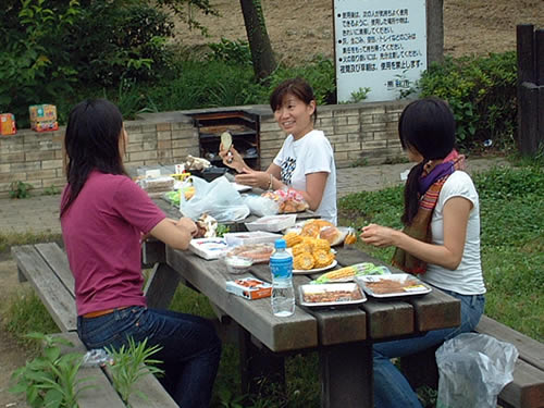 We set off around 10:15 from Ikebukuro and made it to the camp-site in Higashi-Matsuyama around 3:30, where Aya and Su-Young were already sat looking bored. I gave them a frisbee and we set off to pick up Kumi at the Cotton Cafe and get BBQ supplies.