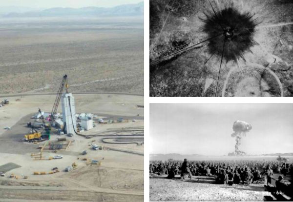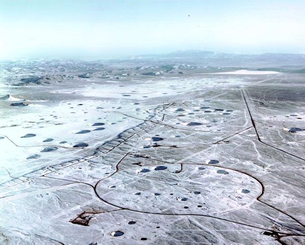 Tests in the deserts of Nevada were moved underground since 1962, and have continued until the present day, with 926 of 1021 of the US’s nuclear tests conducted there. 126 tests were conducted elsewhere, many at the Pacific Proving Grounds in the Marshall Islands. Underground tests leave ‘subsidence craters’ which are clearly visible from the air.