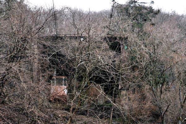 | The Shimoda Grand looms like a listing battleship on a swell of green, doomed to eventually sink without trace, swallowed up by the knotty growth of years. This was the third ruin on the first day of our road trip into Izu. Shimoda is famous for its gorgeous (imported) white sand beaches, and for being the lookout point where Colonel Perry was first seen chuffing towards Tokyo harbor in his black iron-clad steam ships. | Scrunched up behind thickets of winter-boned brush off the banks of a man-made lake, the last remaining carriage of the Okutama Ropeway hangs slack in its berthing perch. Once a completely false folly, it is now consigned to be the most natural thing there, with clotted brown leaves as its only passengers, vines clinging to the station walls the only attendants. |