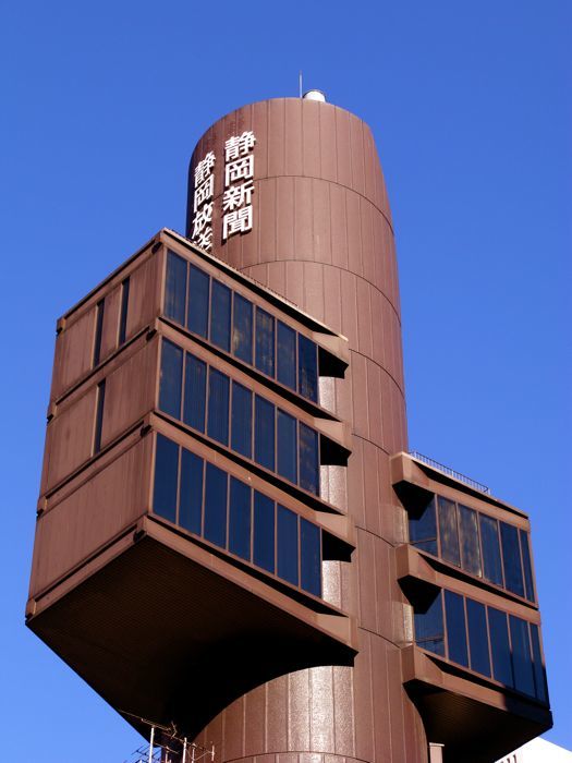 The headquarters of the Shizuoka newspaper in Shimbashi, Tokyo, is another Kenzo Tange building- he of Fuji Terebi and the Tocho. It resembles nothing so much as a giant mutated baobab tree, vivid rust-colored and sprouting fat boughs that elide in stubby endings, on one side its groping knubs reaching out to latch onto the closest building.